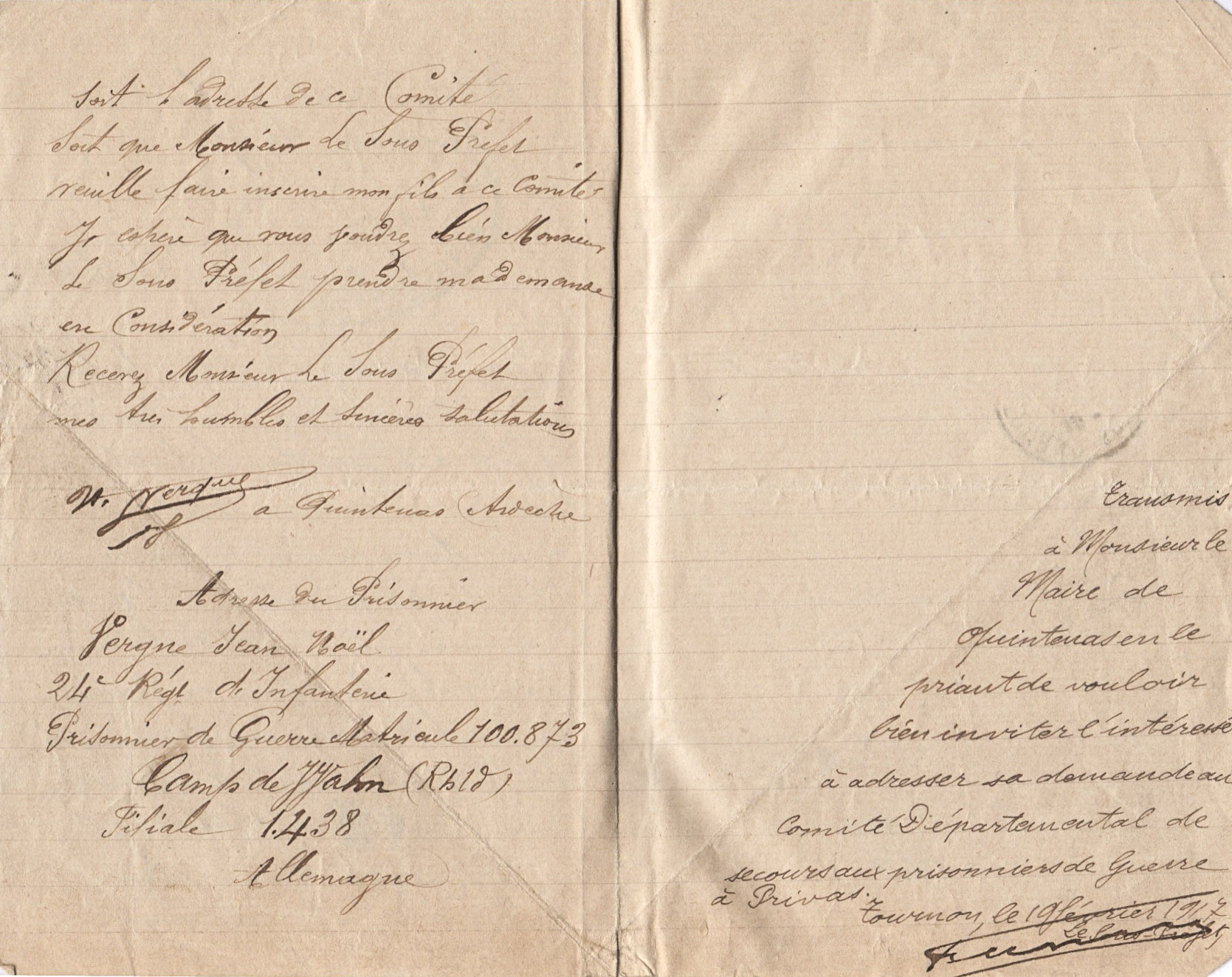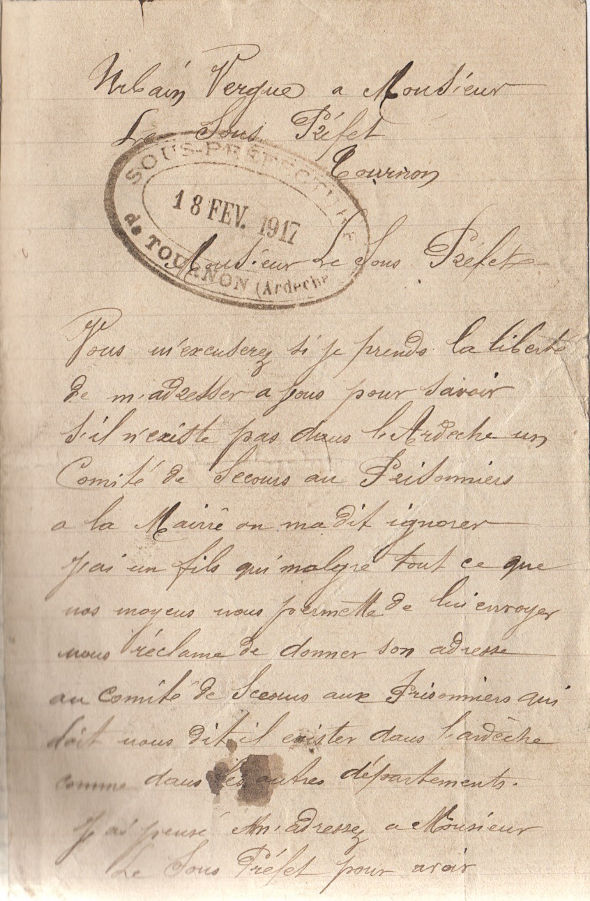 Courrier d'Urbain Vergne à la Sous-Préfecture de Tournon - Février 1917 Courrier d'Urbain Vergne à la Sous-Préfecture de Tournon - Février 1917 Partagez cet article, choisissez votre plateforme ! FacebookXLinkedInTumblrPinterestEmail