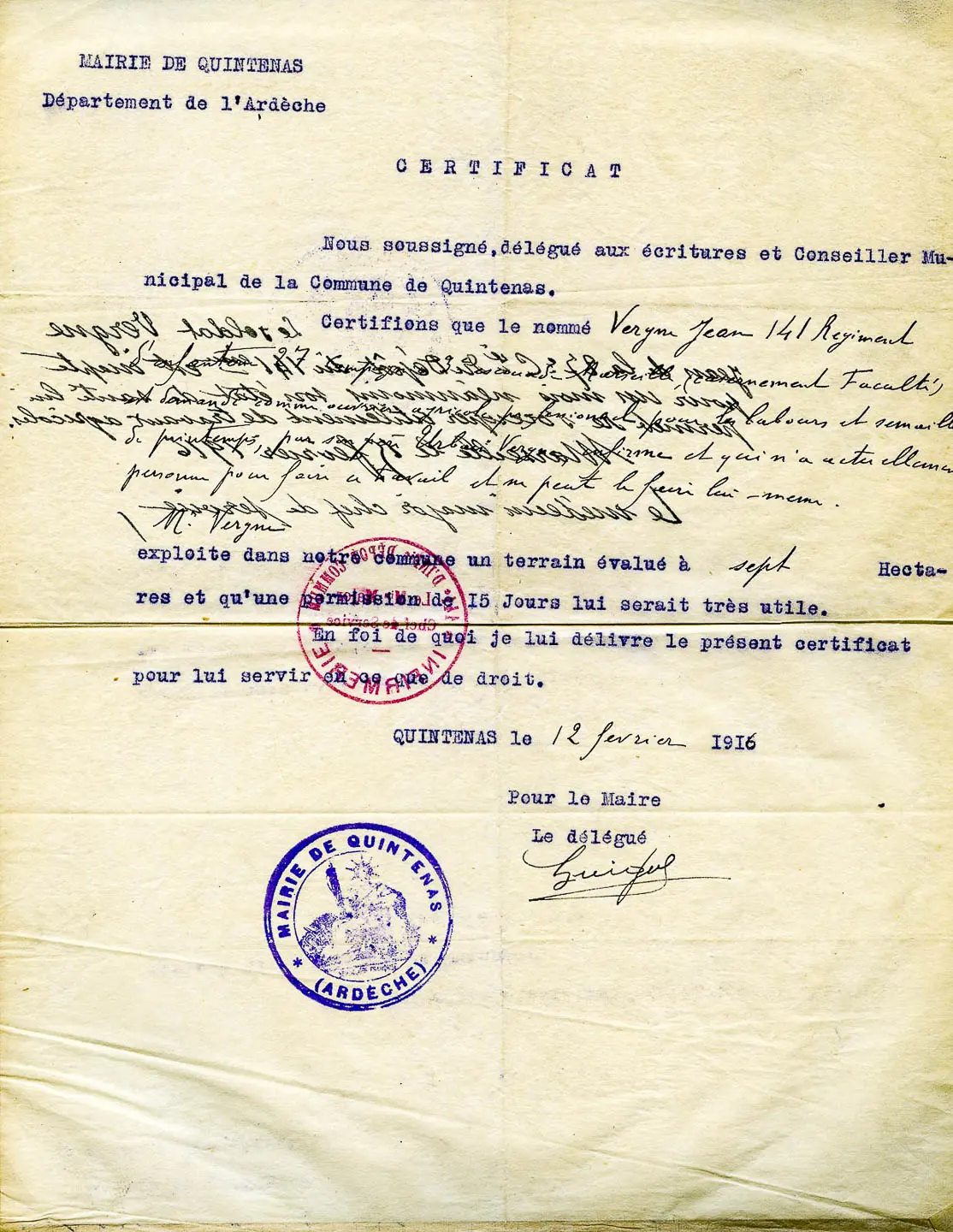 « Mon père m’envoie une coupure du journal à propos des permissions agricoles. Il pense que je pourrai en obtenir une.Auguste Faurie, de retour du front, est venu les voir. Il se rend à Aix et Tarascon pour y être désarmé car il est mobilisé dans une unité de guerre en qualité de tourneur sur métaux. »