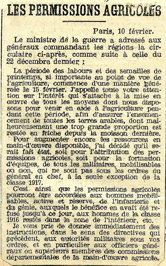 Les permissions dites « agricoles » apparaissent suite à une décision du Ministre de la guerre en date du 1er septembre 1915 : 15 jours accordés entre le 1er septembre et le 15 décembre. Sont concernés les propriétaires exploitants, fermiers, métayers, maîtres-valets, domestiques agricoles et ouvriers agricoles.