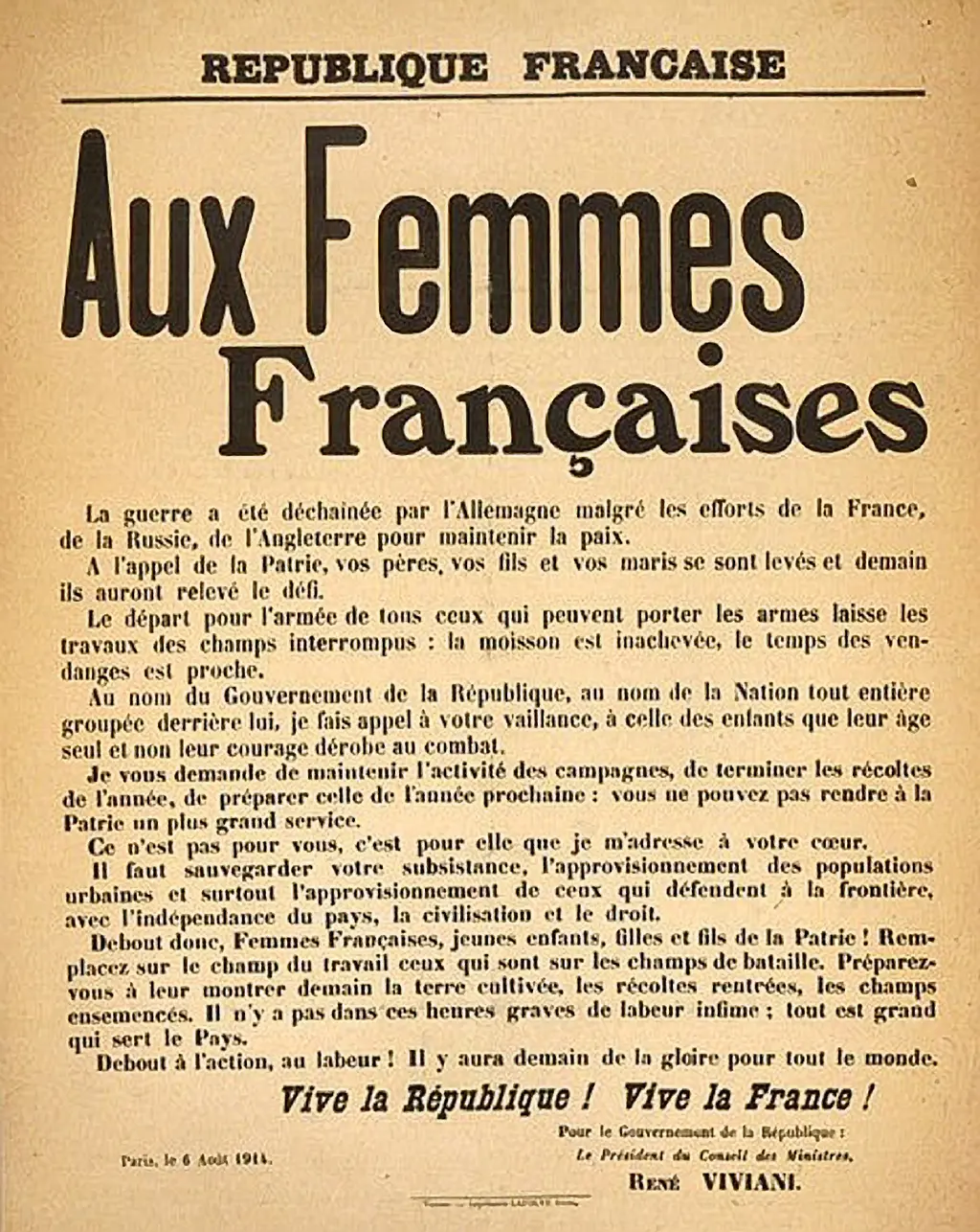 Les autorités civiles et militaires françaises n’ont prévu aucun plan de ravitaillement ou de production de guerre. Viviani s’adresse uniquement aux populations rurales ; le monde urbain et industriel est totalement éludé. Dans une France encore très rurale, la mobilisation intervient en pleine période des grands travaux agricoles. Il faut donc que la main-d’œuvre masculine soit provisoirement remplacée par les femmes et les enfants.