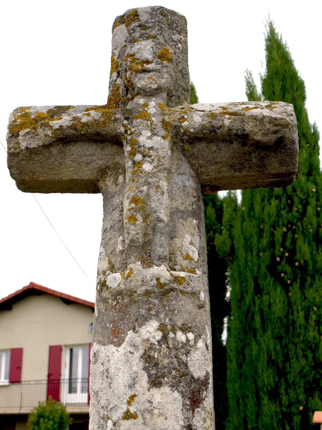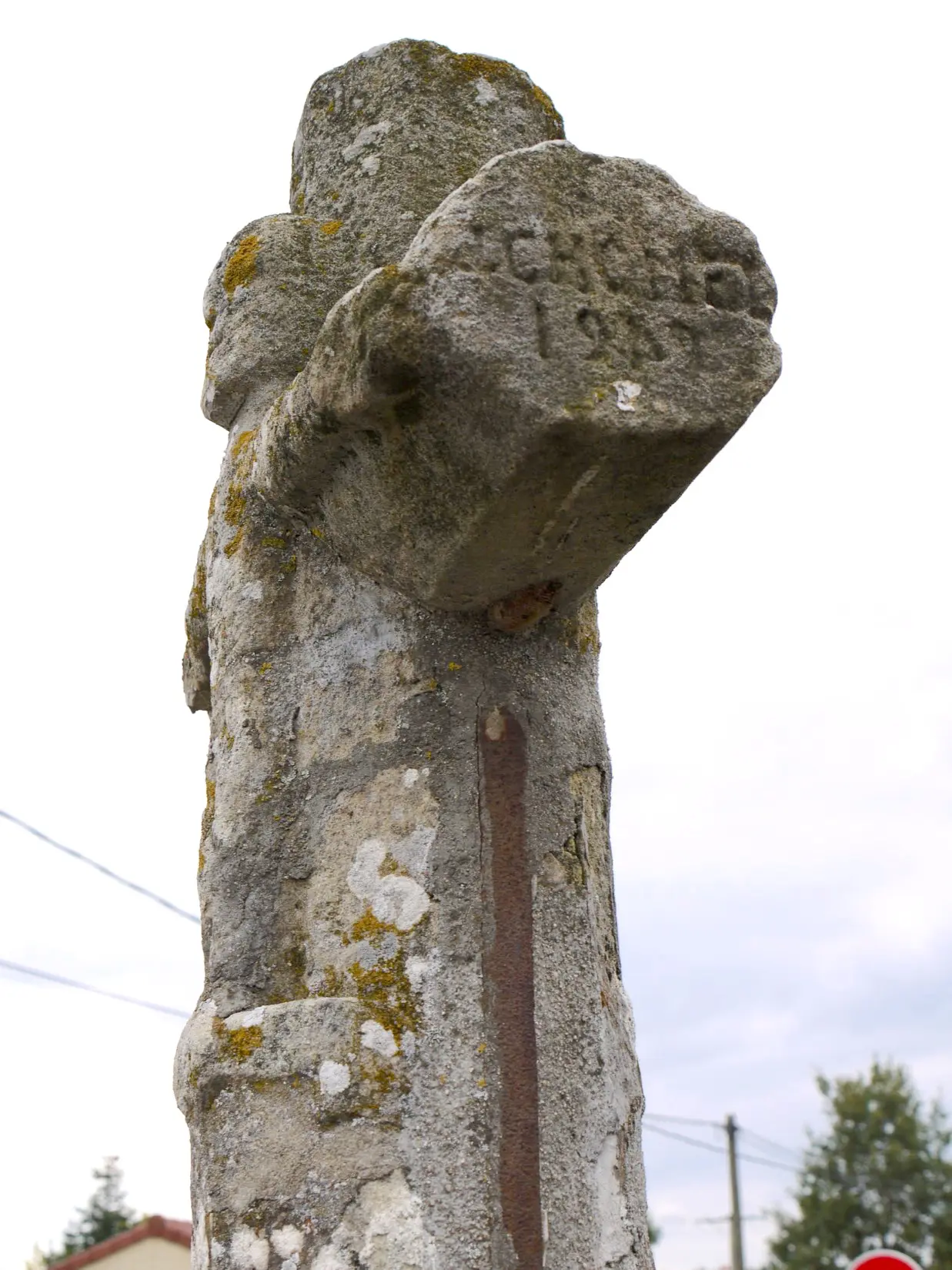 Croix ancienne, en pierre sculptée, signée en 1942 par Jean Chomel, maçon (père de Mmes Coste-Chareyre, Chirol et Pleynet).