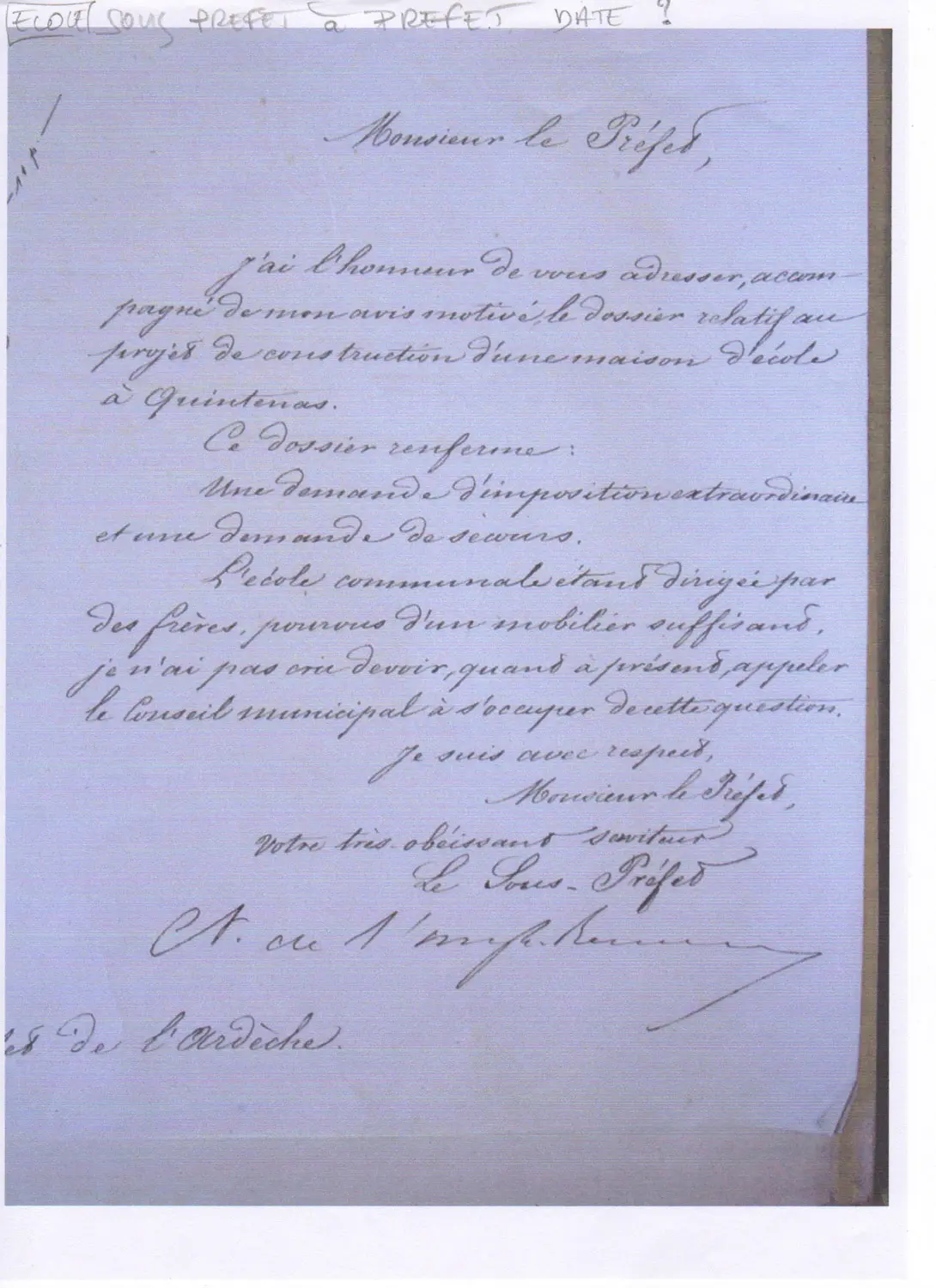 Le bâtiment de l’école communale n’appartient pas à la commune mais à M. Fournat de Brézenaud à qui elle le loue. Le Conseil Municipal envisage de construire une maison d’école ; nous ne savons pas sur quel terrain. Les sommes à engager pour cette construction ne sont pas finançables par la commune de Quintenas. Le dossier relatif à la construction d’une maison d’école, consultable aux Archives Départementales de l’Ardèche, contient une demande pour la somme de 3 160 F en sus d’une imposition extraordinaire de 7 000 F.