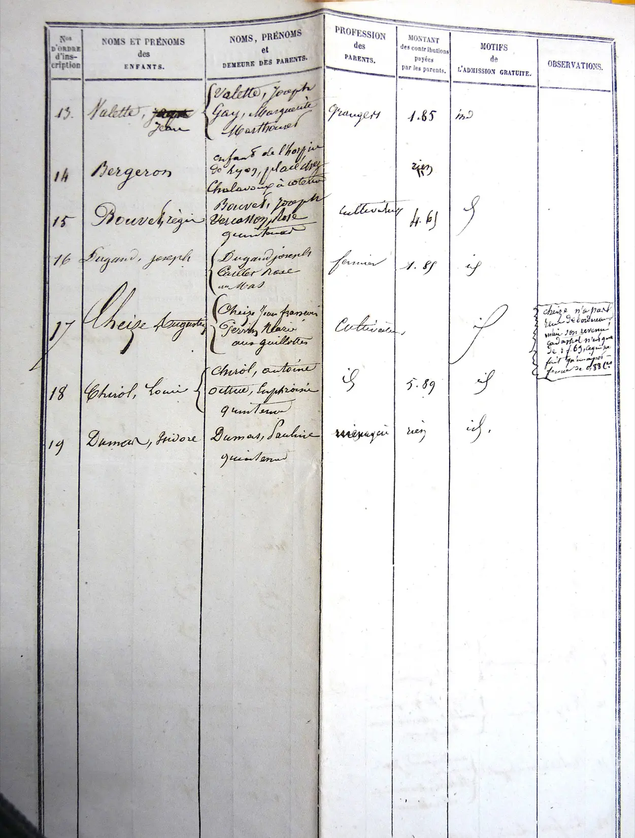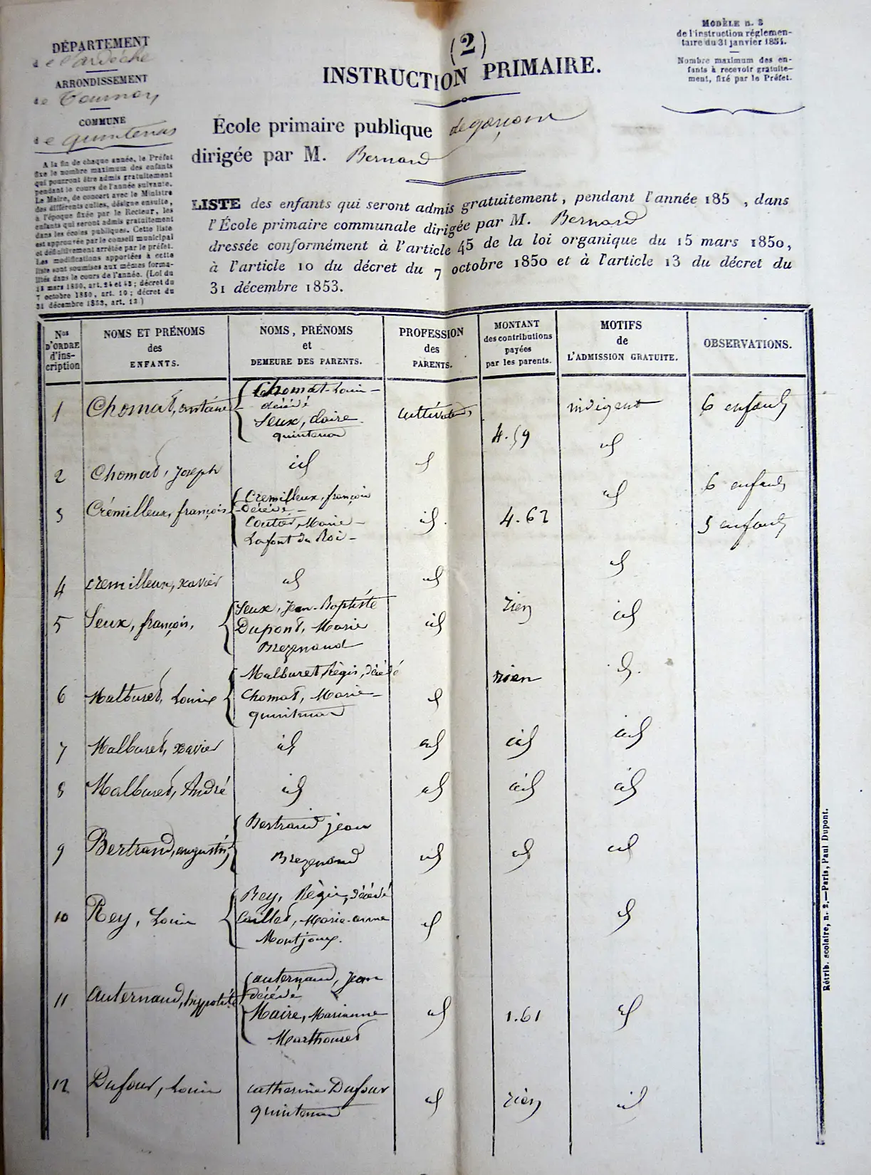 Le Conseil Municipal approuve la liste des enfants devant être admis gratuitement à l’école communale établie par M. le Maire et M. le Curé. Dix-neuf élèves de M. BERNARD, instituteur, ne paieront pas les frais de scolarité pour l’année 1859. Parmi eux deux enfants CHOMAT, deux enfants CRÉMILLEUX de La Font-du-Roi, trois enfants MALBURET, Louis REY de Montjoux et Hyppolite AUTERNAUD du Marthouret sont orphelins de père. Deux autres, Louis DUFOUR et Isidore DUMAS, sont des enfants naturels et n’ont pas de père. Le petit BERGERON (pas de prénom) quant à lui est un enfant de l’hospice de Lyon placé chez CHALAVOUX à Coterue. Tous les autres ont des parents déclarés indigents.