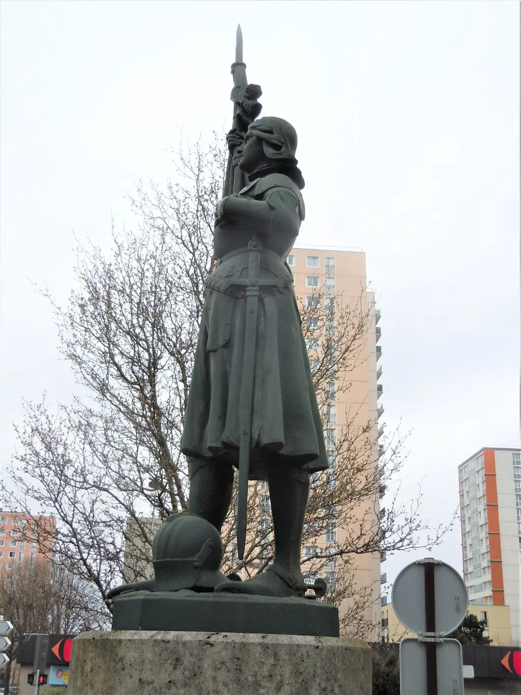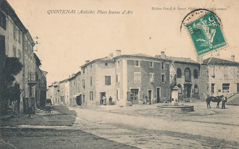 Elle domine bravement la place de notre village, plantée en haut de la fontaine publique. Les Quintenassiens vivants l’ont toujours vu là. Jeanne d’Arc est si familière dans le paysage que la place de l’Église a même été appelée place Jeanne d’Arc au début du XXesiècle comme en attestent ces cartes postales.