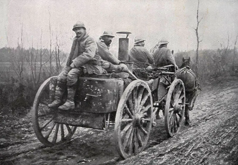 Chaque jour le soldat attendait avec impatience le rata apporté par la roulante. Cette cuisine mobile était stationnée à l’arrière des tranchées, équipée d’une cuisinière et des ustensiles nécessaires à la préparation des repas. De là des hommes partaient ravitailler les tranchées, souvent au risque de leur vie.