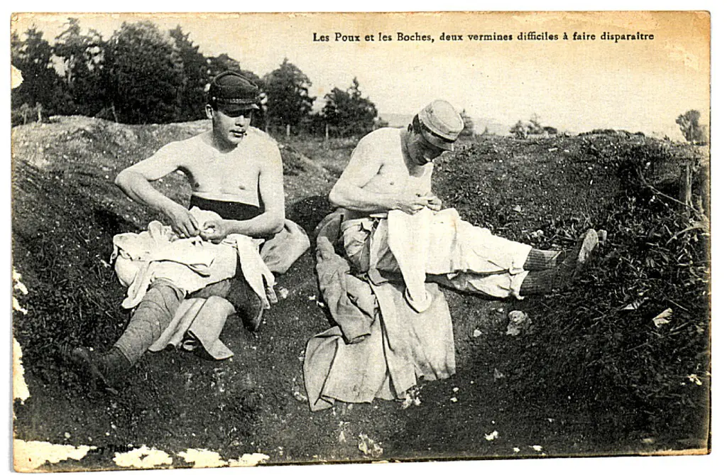 Ne pouvant se laver pendant des jours, parfois pendant des semaines, les hommes profitaient de leurs séjours à l’arrière du front, pendant les périodes de repos, pour se laver. Mais les installations étaient rudimentaires dans ces zones dévastées. Les soldats se contentaient souvent d’une toilette à l’eau froide dans les cours d’eau ou les fontaines. L’hygiène était bien souvent sacrifiée pendant l’hiver.